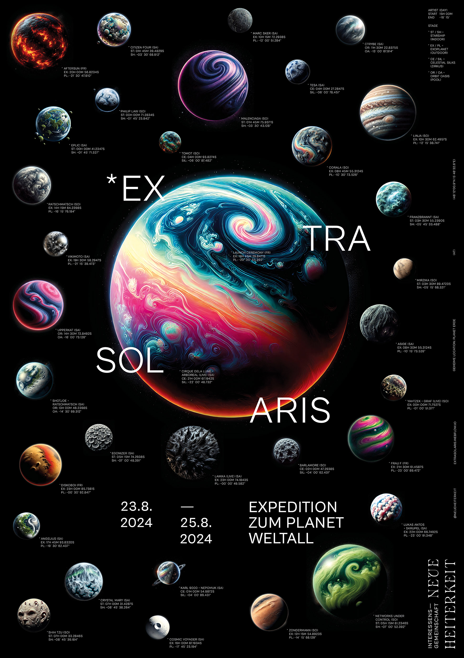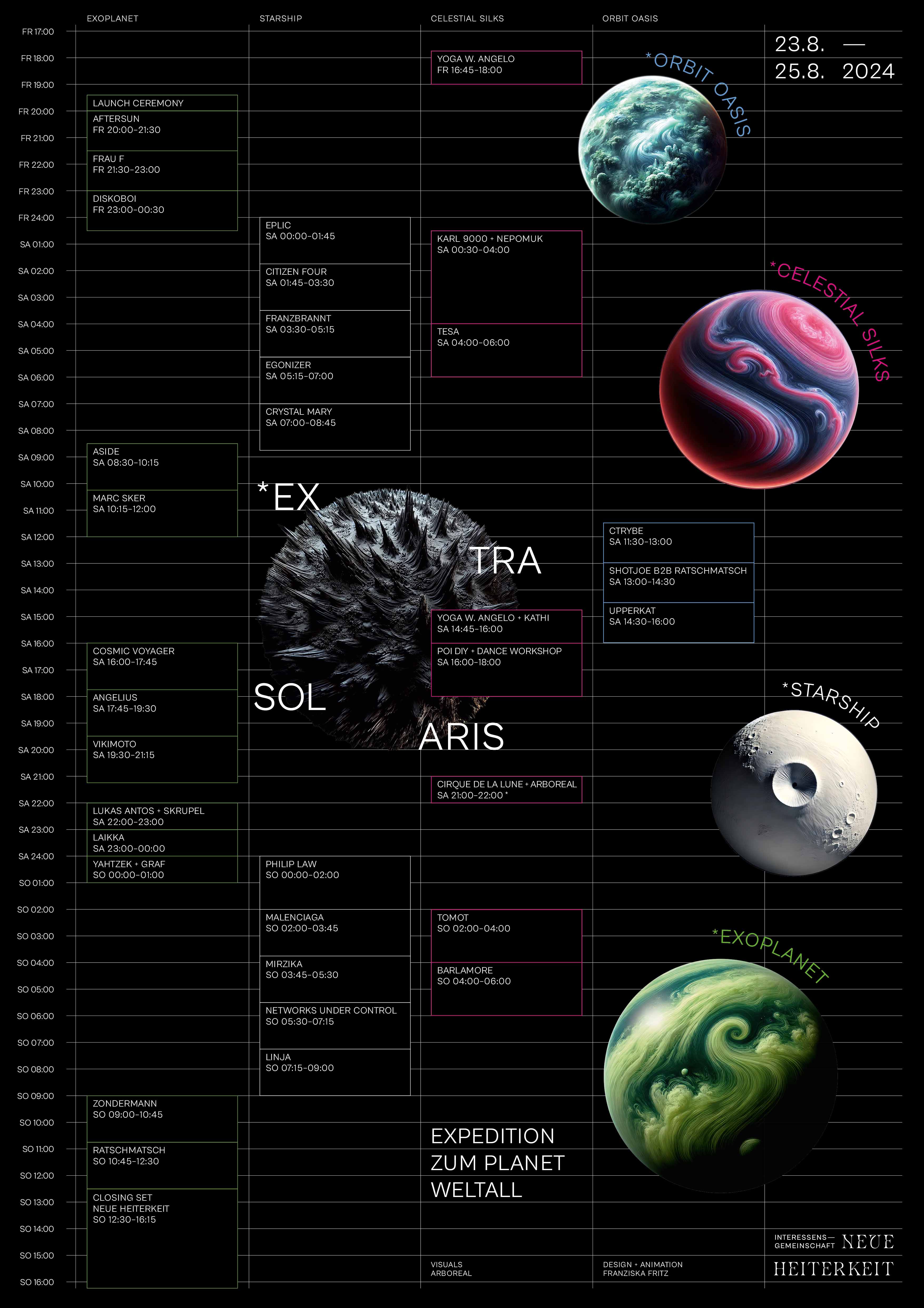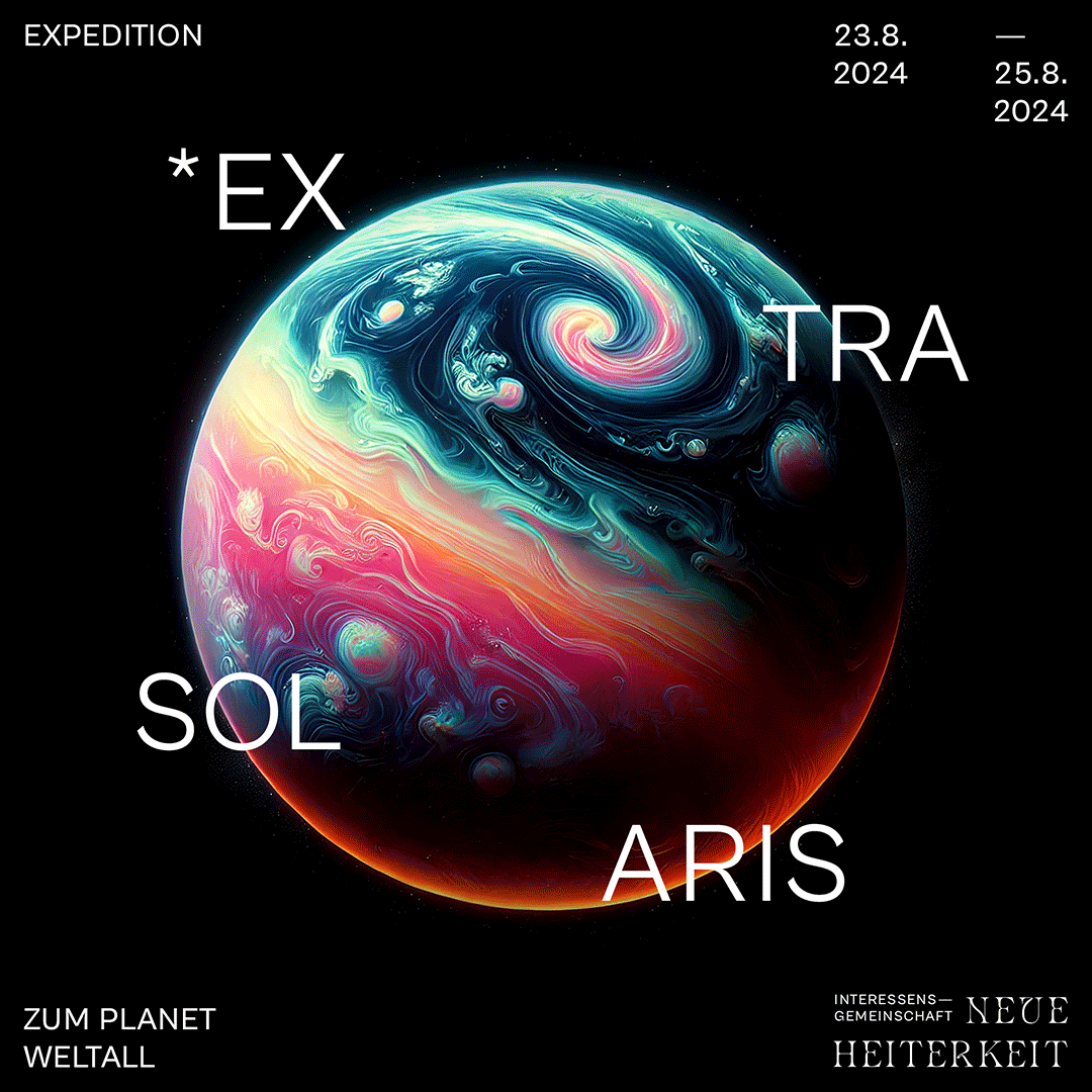 Die Interessensgemeinschaft neue Heiterkeit ist ein Kollektiv, das Parties und private, interdisziplinäre Festivals veranstaltet, welche Musik, Kunst und narrative Gestaltung zu einer immersiven Welt vereint. *EXTRASOLARIS ist das zweite Kapitel einer fortlaufenden Festivalreihe, die eine kontinuierliche Geschichte erzählt.